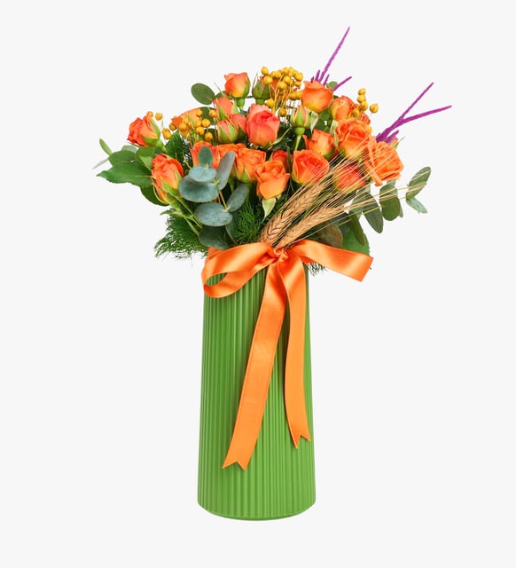 Turuncunun sıcaklığı, morun derinliği ve buğday başaklarının dingin taneleri… Bir pencere kenarında, iyileşen bir günün yumuşak ışığına eşlik eden sakin bir renk düzeni. Okaliptusun serin nefesi, solucan otunun modern çizgisi ve sarı lunanın nazik parıltısı, zihni toparlayan bir sükunet yaratır. Yeşil çizgili polimer vazoda turuncu kurdele, aranjmanın nazik ritmini tamamlar; sade ve incelikli.