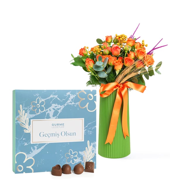 Geçmiş Olsun Çiçek Aranjmanı ve Gurme Lezzetler Çikolata Kutusu