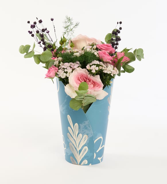 Yumuşak pembe tonların morla buluştuğu bu kutu aranjman, odada sakince yayılan bir umut hissi taşır. Okaliptusun serin nefesi, mirkeladusun ince çizgileri ve hüsnüyusufun narin dokusu, iyileşme günlerine sessiz bir eşlik sunar. Çardak güllerin sıcaklığı ve Mor Luna’nın derinliği, kırılgan anlara güç, telaşlı saatlere dinginlik katar.
