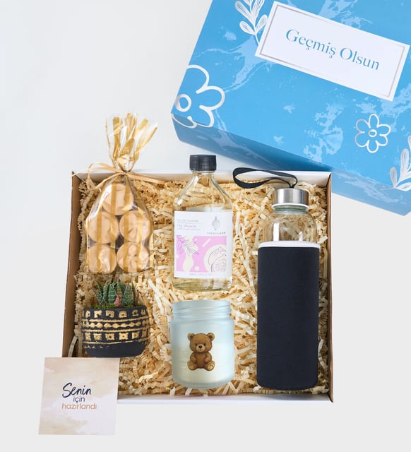İçinde hisler kadar nesneler de dengede: kılıflı cam matara avuca oturan dinginliğiyle gün boyu eşlik eder; ayıcık formundaki mum, aleviyle ya da sadece varlığıyla mekana yumuşaklık katar; incir kokulu kolonya, temiz bir tazelik notası bırakır; sukulent, sade bir yeşille sürekliliği hatırlatır. Kısa bir tatlı mola için, beyaz kutlama konseptli kokolinlerle süslenen siyah kakaolu silindir kekler sunumu tamamlar. Sarı kırpık kağıtların üzerinde, “Geçmiş Olsun” mesajlı özel kutu ve “Senin İçin Hazırlandı” pankart, zarif bir sunum dili kurar.