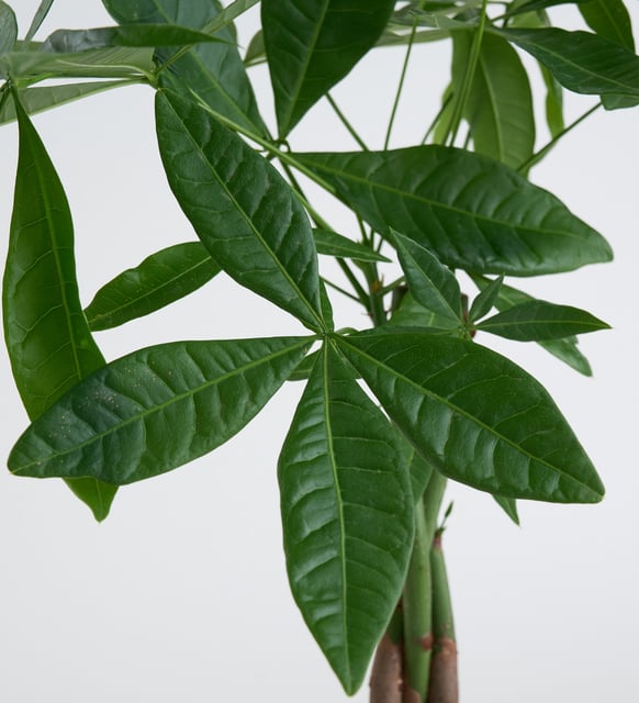 Geometrik çizgilerin dingin ritmiyle, Pachira’nın parlak yeşilleri aynı çerçevede buluşuyor. Betonun yalın ağırlığı bitkinin sakin nefesini taşırken, para ağacı olarak anılan bu zarif varlık bolluğu doğrudan anlatmaz; mekâna yerleşip bekler, uğurun sessiz bir hatırlatıcısı gibi.