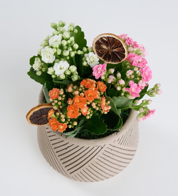 Şehrin dingin çizgileri ile baharın sıcak renkleri aynı ritimde buluşuyor. Geometrik desenli, eskitme görünümlü beton saksı içinde, sarı, pembe ve turuncu mini Kalanchoe’lar sessizce açar; bulunduğu mekana hafif bir neşe, sakin bir canlılık taşır. Kompakt formu, gözün yorulmadan dinleneceği küçük bir peyzaj gibi; gün ışığına döndükçe renkler yumuşar, akşamüstünde ise loş bir parıltı bırakır.