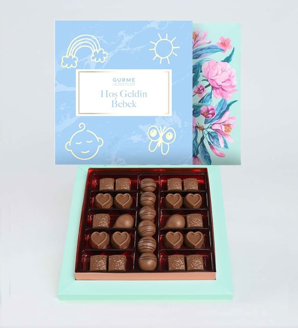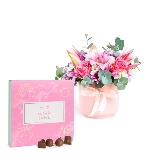Hoş Geldin Bebek Gurme Lezzetler Kutulu Pembe Lilyum Aranjmanı