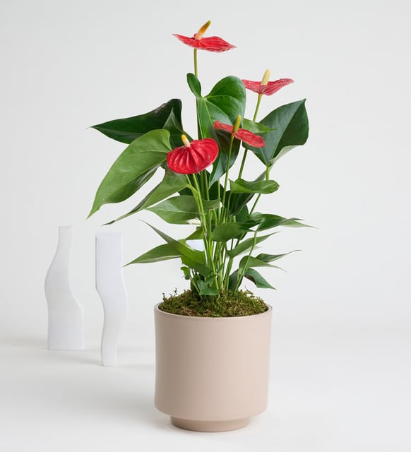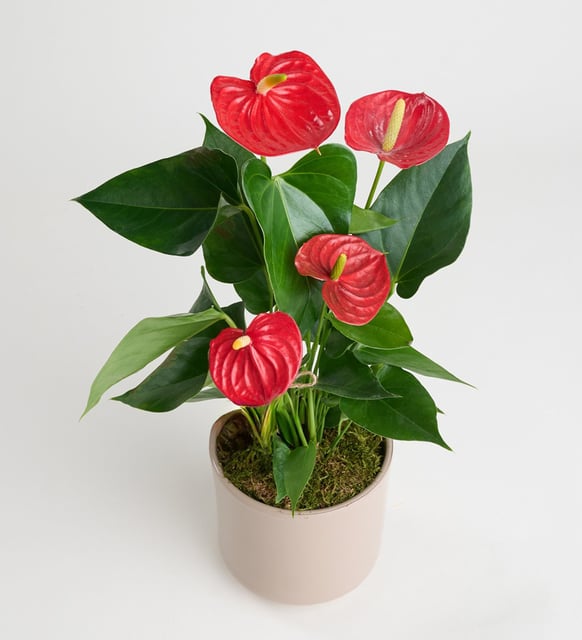 Parlak kırmızının sakin griyle buluştuğu bir an. Antoryumun cilalı çiçek yüzeyi, derin yeşil yaprakların dinginliğiyle nefes alırken, beton saksı kompozisyona zarif bir ağırlık ve modern bir ritim kazandırır. Bulunduğu odada enerji yükselir; mekana uyum sağlayan, ancak kendi karakterinden ödün vermeyen bir duruş.