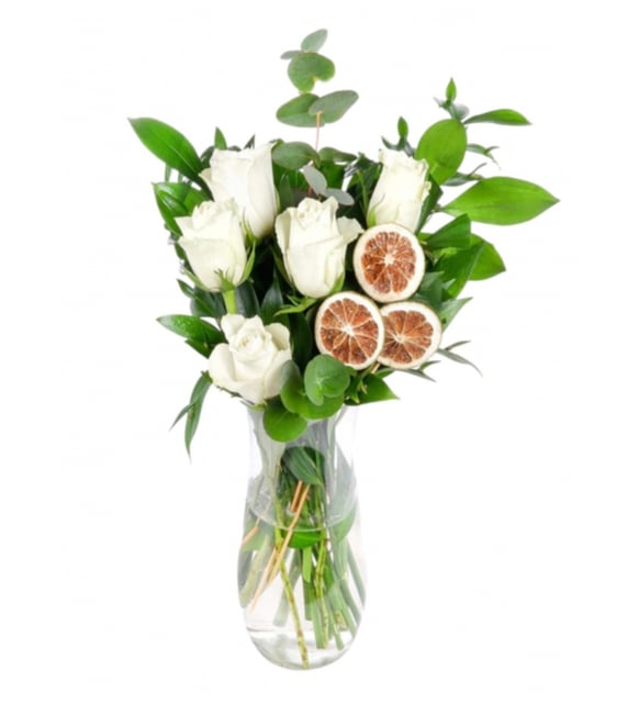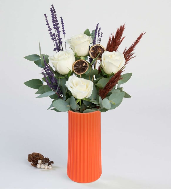 Turuncu Çizgili Polimer Vazoda 4 Beyaz Gül