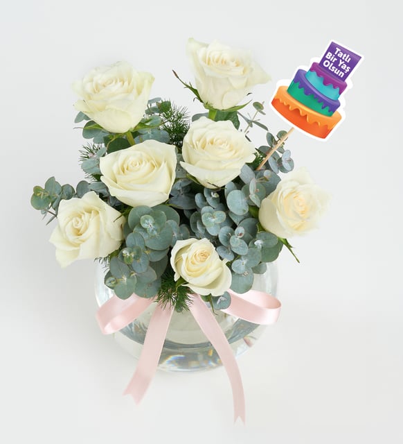 Tatlı Bir Yaş Pankartlı Cam Akvaryumda 7 Beyaz Gül