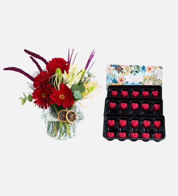 Kalpli Gurme Lezzetler Kutulu Kırmızı Gül & Beyaz Gerbera Aranjmanı