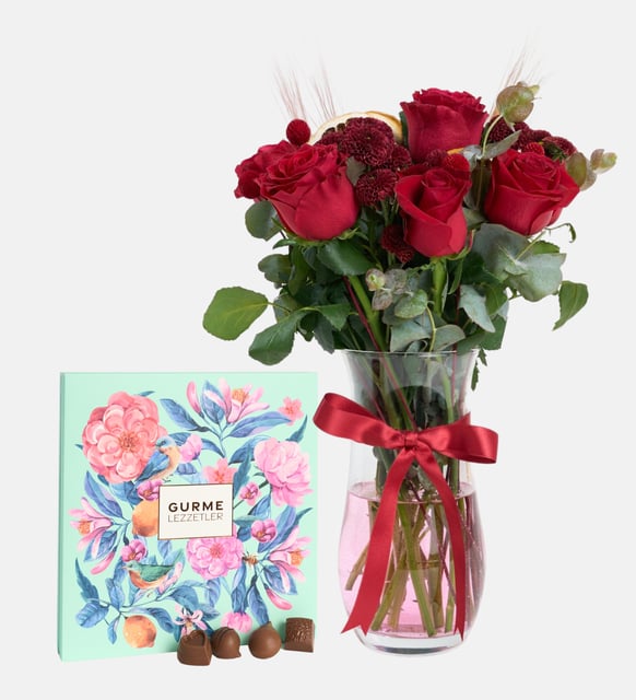 Kırmızı Gül ve Gurme Lezzetler Kutulu Cam Vazoda Aranjman