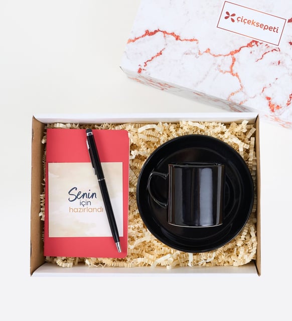 Saksıda Beyaz Orkide ve Siyah Fincanlı Hediye Seti