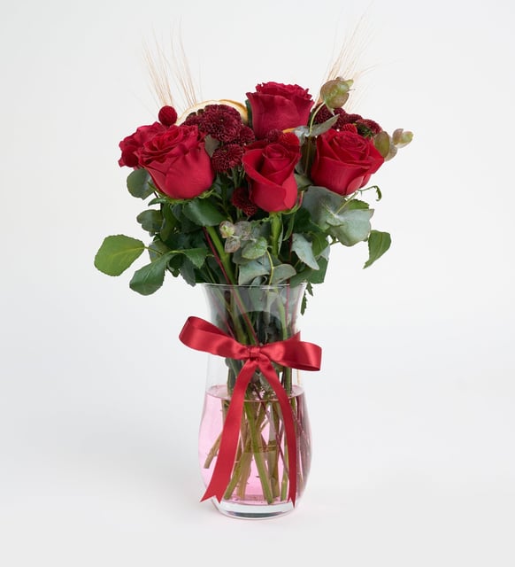 Kırmızı Güllü Gurme Lezzetler Kutulu Cam Vazo Aranjmanı