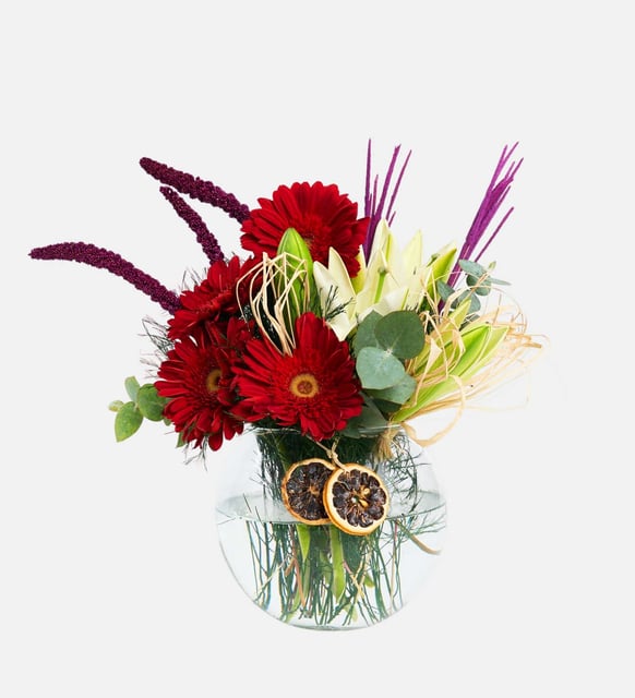 Akvaryum Vazoda Lilyum ve Gerbera & 20'li Gül Kek
