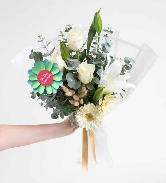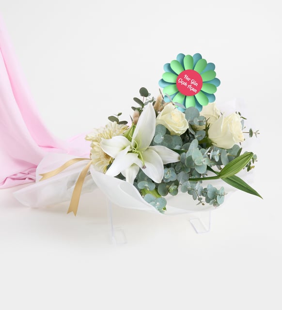 Gündelik ışığın yumuşak saatlerine yakışan dingin bir kompozisyon. Beyaz güllerin duru zarafeti, lilyumların büyüleyici kokusu ve gerberaların neşeli canlılığı, odada hafifçe yayılan bir mutluluk hissi bırakır. Doğal okaliptus dalları ferah bir esinti taşırken, bej lagurusun kadifemsi dokusu sıcak bir denge kurar. Sarı yaldızlı kurdele ve kenarı beyaz çizgili beyaz buket kağıdı, aranjmana sakin bir şıklık çizer. Üzerindeki Her Gün Çiçek Açsın pankartı, küçük anların değerine nazik bir hatırlatma gibi durur.