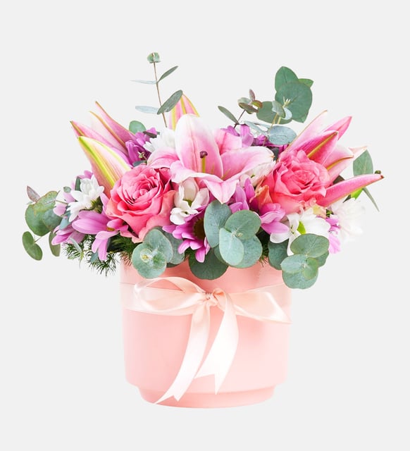 Pembenin en nazik tonları, evin içine yeni bir nefes gibi yayılır. Lilyum ve papatya, sabahın ilk serinliğini taşır; okaliptus, aralıktan sızan taze havayı hatırlatır. Pembe gül, zamanı yavaşlatan bir anın zarif imasıdır; mirkeladus bu anı dingince tutar. Açık pembe kurdele ve üzerinde Hoş Geldin Bebek yazılı gurme lezzetler kutusu, ilk gülümsemeyi sakince not düşer.