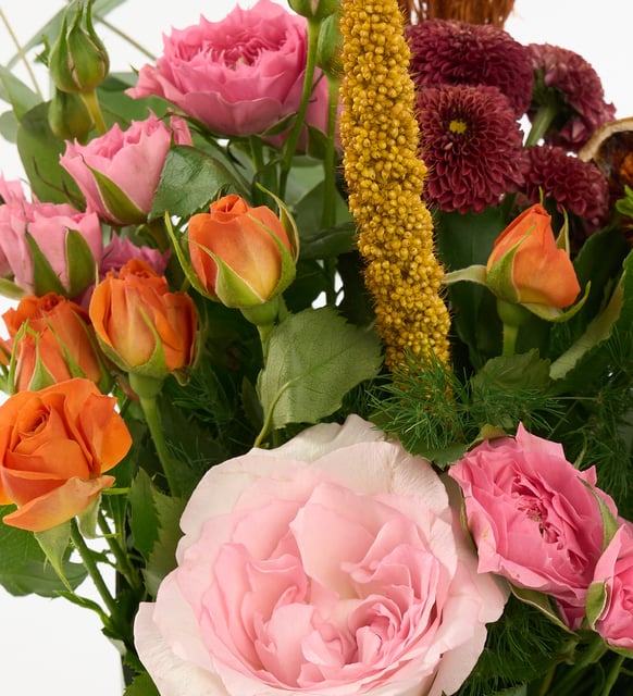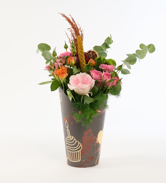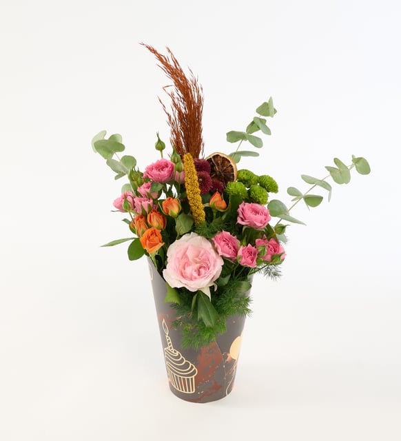 Kutunun üzerinde İyi ki Doğdun mesajı, yeni yaşın eşiğinde zarif bir tebessüm gibi durur. İçeride pembe ile turuncu yumuşak bir canlılıkta buluşur; bordo ton, kutlama anına olgun bir ritim ekler. Pampasın pudramsı dokusu ve sarı setterianın hafif titreyişi doğallığı taşırken, okaliptus ve mirkeladusun serin yeşili mekana taze bir nefes bırakır.