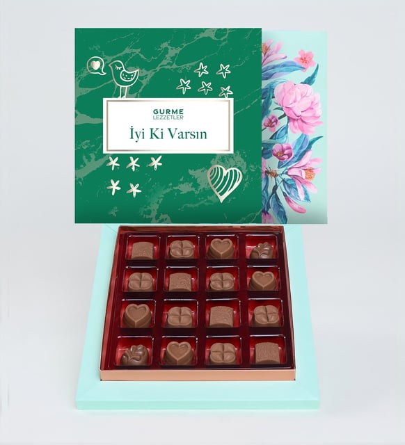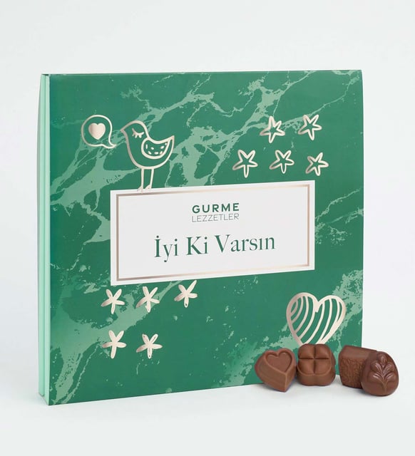 Sakin bir teşekkürün, içten bir minnettarlığın küçük ve zarif bir kutuda toplanmış hâli. Üzerindeki nazik "İyi Ki Varsın" mesajı, sade bir anı yumuşatır; her parça, paylaşırken oluşan sıcaklığı taşır. Yumuşak sütlü dokular, kalp ve kare formların dingin ritmi, palmiye esintisi desenlerinin hafif bir tatil hissi… Bu kutu, kısa bir molada, bir kahve yanında ya da sessiz bir tebrikin ardından, duygulara eşlik eden tatlı bir fısıltı gibi.
