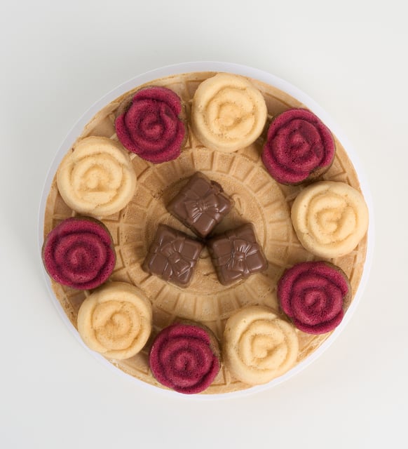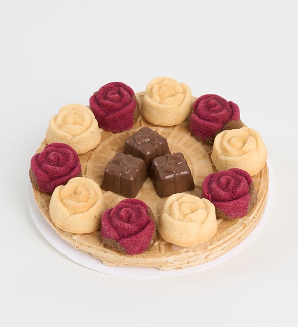 İncecik, çıtır kağıt helvanın üzerinde iki ayrı tonda açan gül kekler; kırmızının sıcaklığıyla beyazın dinginliğini bir araya getirir. Sütlü ve fildişi konfiseri kuvertürün zarif dokunuşu, yumuşak bir dokunun ağızda sessizce çözülmesini fısıldar. Küçük bir kutlamanın tatlı anı gibi, nazik ve ölçülü.