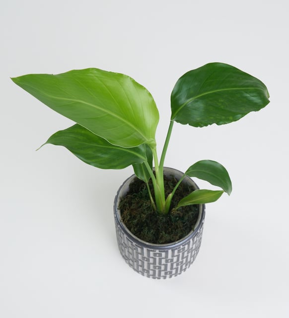 Şehir ritmini taşıyan kare desenli gri beton saksı, starliçenin heykelsi yapraklarına dingin bir çerçeve sunar. Büyük ve parlak yüzeyleriyle yapraklar, ışıkla yumuşak bir oyun kurar. Tropik bir gösterişten çok, ölçülü bir serinlik hissi bırakır. Çiçeksiz formunda bile mekânın temposunu sakinleştirir, modern çizgilerle doğal bir denge kurar.