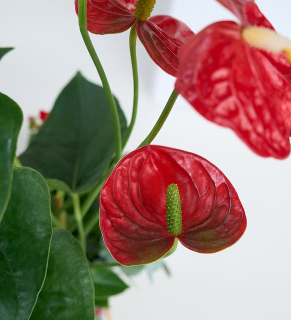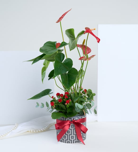 Kare Desenli Saksıda Antoryum ve Kırmızı Kalanchoe