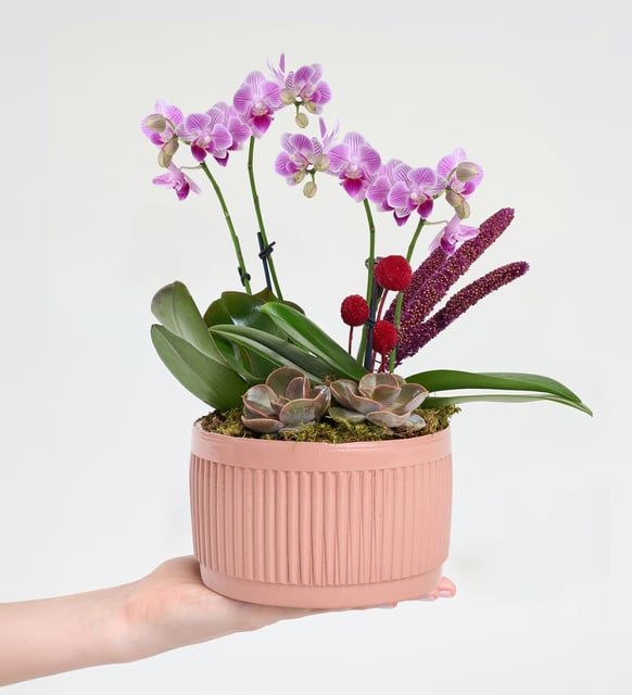 Yumuşak bir sabah ışığına benzeyen bir sakinlik. Kiremit tonundaki seramik saksının içinden, mor mini orkideler narin bir ritimle yükselirken, Echeveria Perle Von Nurnberg’in pudramsı yaprakları kompozisyona sessiz bir denge katıyor. İnce, içten ve daima zarif; mekana girdiği anda bir anı sessizce çerçeveleyen türden.