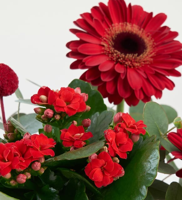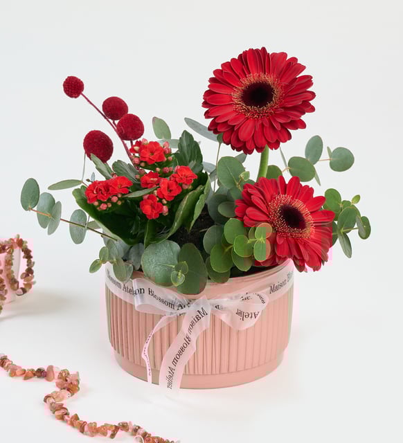 Kiremitin sıcak tonunda saklanan bir dinginlik; kırmızının nabız gibi atan enerjisiyle buluşuyor. Gerberaların parlak yüzeyi, yakınlığın ve samimiyetin anılarını çağırırken, kalanchoe’nun dingin yapısı uzun süren bağların sessiz güvencesi gibi eşlik eder. Kırmızı craspedia dokunuşları düzenlemeye modern bir ritim katarken, okaliptüs dalları hafifçe yayılan ferahlığıyla mekânı arındırır.