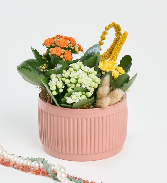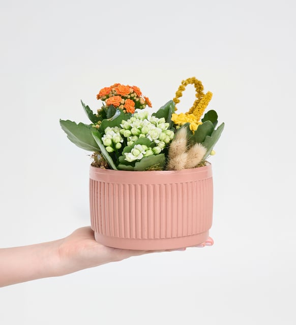 Kiremitin sıcak dokusu, kırmızı, sarı ve turuncu Kalanchoe çiçekleriyle buluştuğunda iç mekana yumuşak bir ışık taşır. Küçük bir huzur anı gibi; masanın köşesine, pencere kenarına ya da girişteki konsola yerleştiğinde günün ritmini sakinleştirir. Neşe ve dinginlik aynı parçada buluşur; kutlamalara zarif bir eşlik, başlangıçlara nazik bir hatırlatma, iyileşmeye doğru atılan sessiz bir adım.