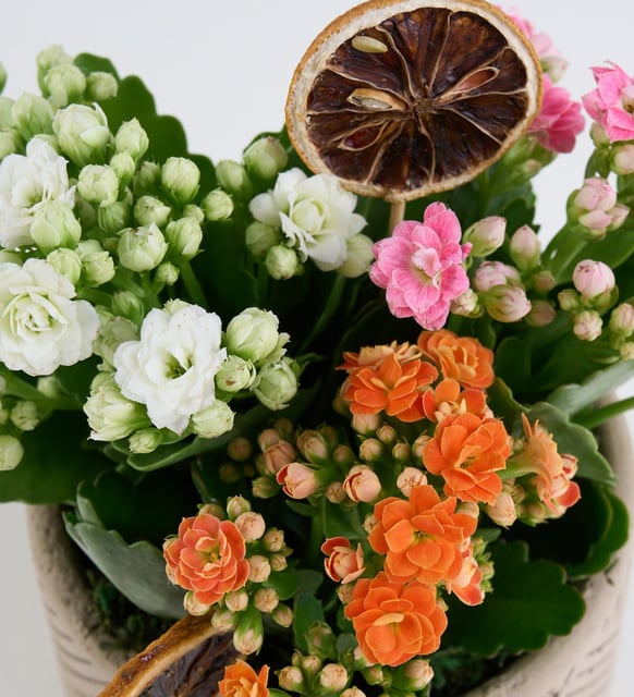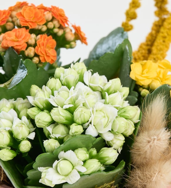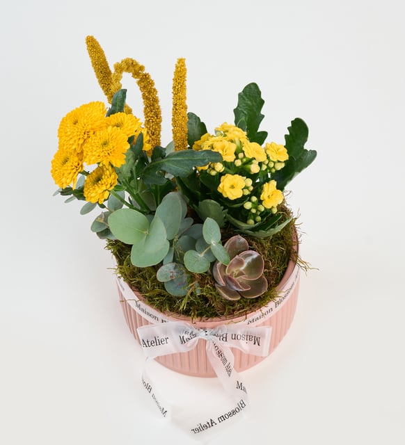 Sarı kalanchoe, kiremit tonlarının sıcaklığında küçük bir güneş gibi açılırken, echeveria’nın dingin geometrisi kompozisyona sessiz bir denge kazandırır. Okaliptusun ince ferahlığı, yosun ve toprakla birleşerek doğanın sakin nefesini iç mekana taşır. Sarı setteria ve top krizantem, aranjmana nazik bir ritim ve zarif bir hareket katar. Küçük ölçekte kurulan bu dünya, masasının köşesinde, pencere kenarında ya da bir kitaplığın rafında usulca parlayan bir huzur duygusu bırakır.