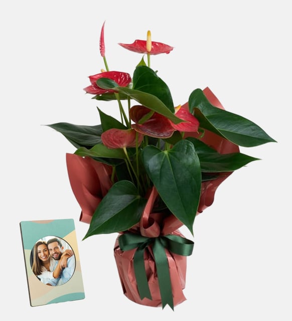 Parlak kırmızının sakin yeşille buluştuğu bir duruş. Antoryumun cilalı çiçekleri, saksıyı kavrayan koyu somon kağıdın sıcak dokusuyla yumuşar; beyaz kurdele dingin bir çizgi, koyu yeşil kurdele ise canlı bir denge bırakır. Modern polimer saksının sade formu, aranjmanın dingin uyumunu taşırken, yanında yer alan çerçeve sticker ile uygulanmış küçük bir görsel ya da sözle anıyı nazikçe tutar.