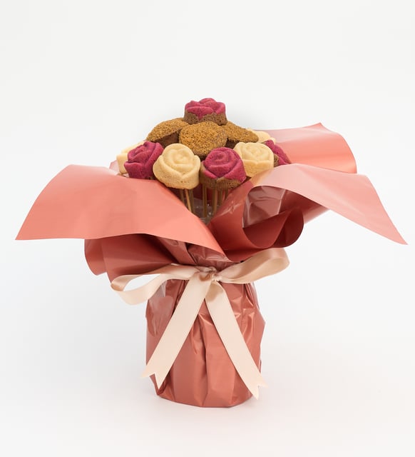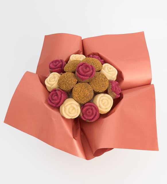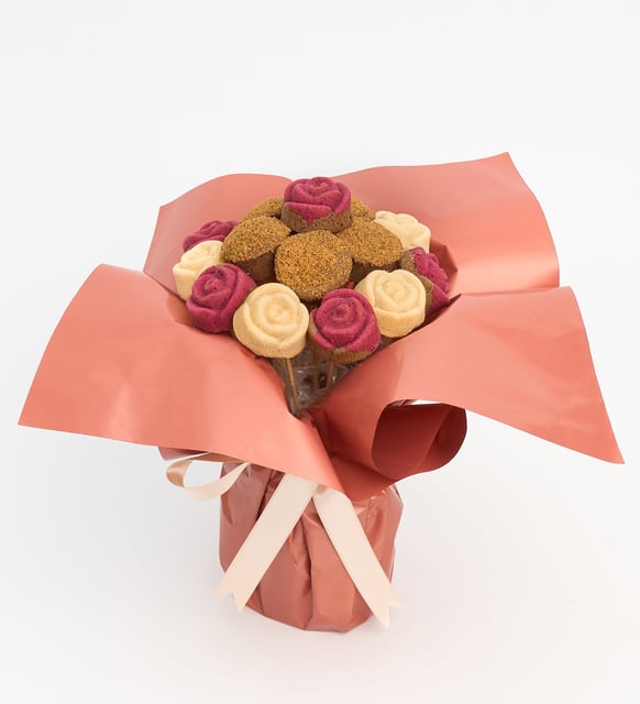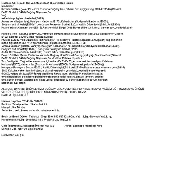 | Süsleme | 5 adet beyaz gül kek, 6 adet kırmızı gül kek, 5 adet siyah kakaolu silindir kek; Lotus Biscoff bisküvi tozu ve sütlü konfiseri ile; koyu somon buket kâğıdı sunum. |