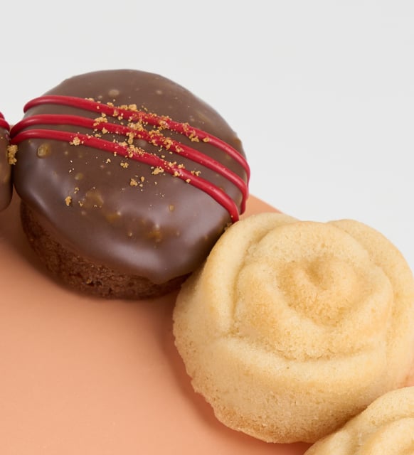Yumuşak bir beyazın dinginliğiyle derin kakaonun gölgesi buluşuyor. Zarif gül biçimli keklerin saf hissi, silindir formdaki siyah kakaolu parçaların yoğunluğu ile dengelenirken, Lotus Biscoff bisküvi tozu karamelimsi bir sıcaklık bırakıyor. Sütlü konfiserinin ipeksi parıltısı ve kırmızı kokolin dokunuşları kompozisyona canlı bir ritim katıyor. Ortada ayrılmış zarif alanda yerini alan bir fotoğraf, bu tatlı düzeni kişisel bir anıya dönüştürüyor; masada, rafta ya da kutlama köşesinde kendi hikayesini fısıldayan bir an.