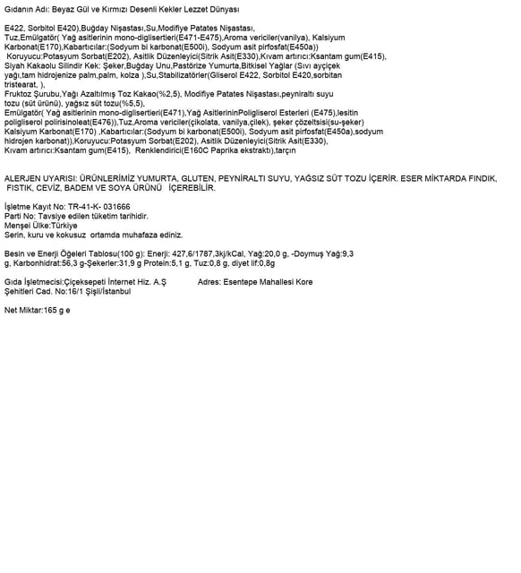 | Süsleme | 7 adet beyaz gül kek ve 4 adet siyah kakaolu silindir kek; sütlü konfiseri, kırmızı kokolin detayları ve Lotus Biscoff® bisküvi tozu ile süslenmiştir. |
