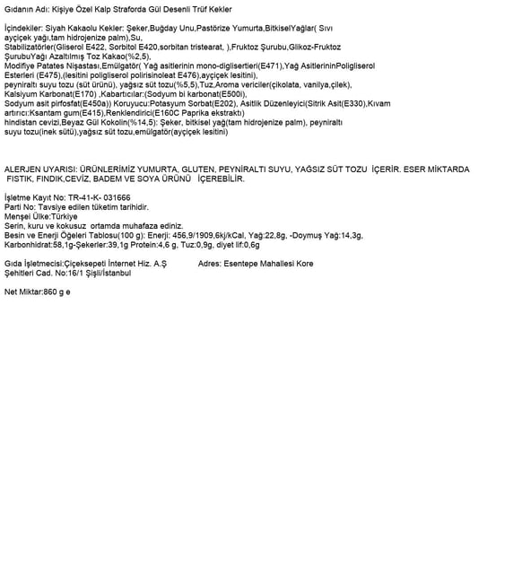 | Süsleme | Somon rengi küçük kalp strafor üzerinde gül desenli sunum; kırmızı kokolin, beyaz gül konfiseri, sütlü konfiseri ve hindistan cevizi dokunuşlarıyla tamamlanmıştır. |