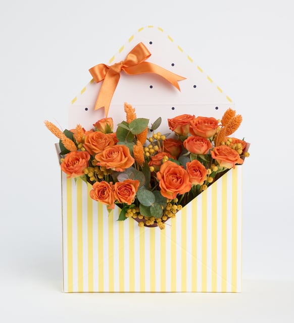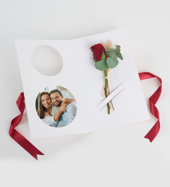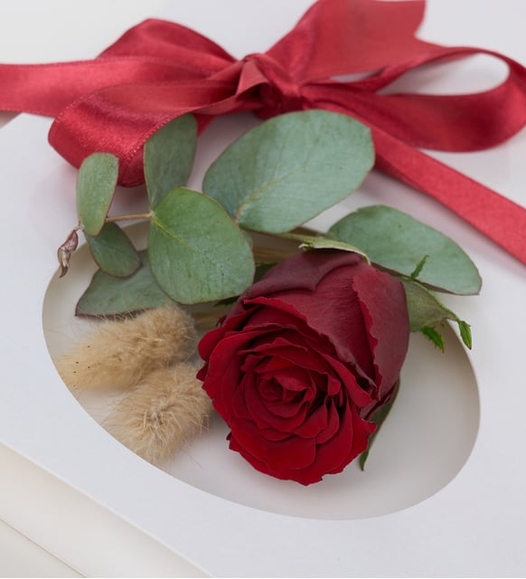 Kırmızının sükunetle parladığı bir anı… İnce okaliptus yaprakları arasından yükselen bir gül, bej lagurusun yumuşak dokunuşuyla dengelenir. Kartın üzerinde yer alan kişiye özel beyaz sticker, içimizde saklanan cümleleri zarif bir çerçeveye yerleştirir. Kırmızı kurdele ve rafyanın sade bitirişi, bu küçük sahneyi bir hatıra gibi tamamlar. Zamanla kıymeti artan, sessiz bir itirafın kâğıt üzerindeki karşılığı.