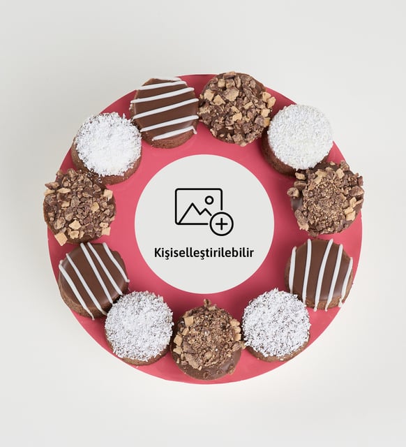 Somon tonunda yuvarlak bir kaide üzerinde, siyah kakao ile kaplı küçük silindir keklerin ritmi sessiz bir mutluluk hissi uyandırır. KitKat kırıntılarının ince dokusu ve hindistan cevizinin yumuşak parıltısı, kompozisyona hafif bir kontrast katar. Aralara yerleştirilen sütlü konfiseriler, ışığı nazikçe yakalayan küçük anlar gibidir. Merkezde ayrılan alan, bir fotoğrafla hatırayı zarifçe sabitlemeye imkân verir; görüntü ve tat, aynı çemberde buluşur.