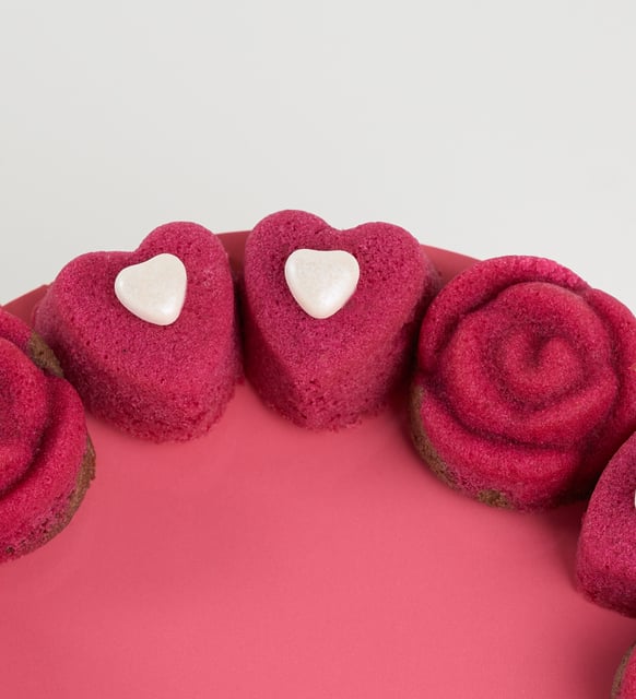 | Süsleme | 6 adet Kırmızı Gül Kek ve 7 adet Kırmızı Kalp Kek; fildişi konfiseri kuvertür ve beyaz sedef kalp şeker ile süslenmiştir. Somon rengi küçük yuvarlak strafor üzerinde düzenlenmiştir. |