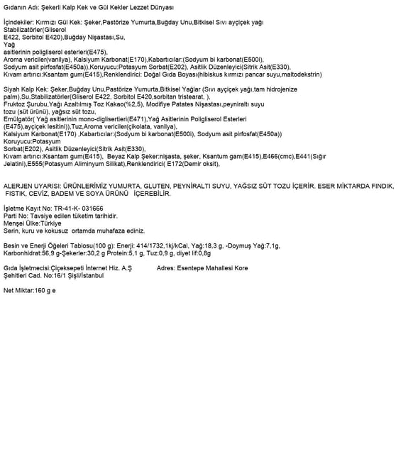 | Süsleme | 4 adet siyah kalp kek ve 8 adet kırmızı gül kek; fildişi konfiseri kuvertür ve beyaz sedef kalp şeker ile süslenmiş, somon rengi küçük yuvarlak strafor üzerinde aranjman. |