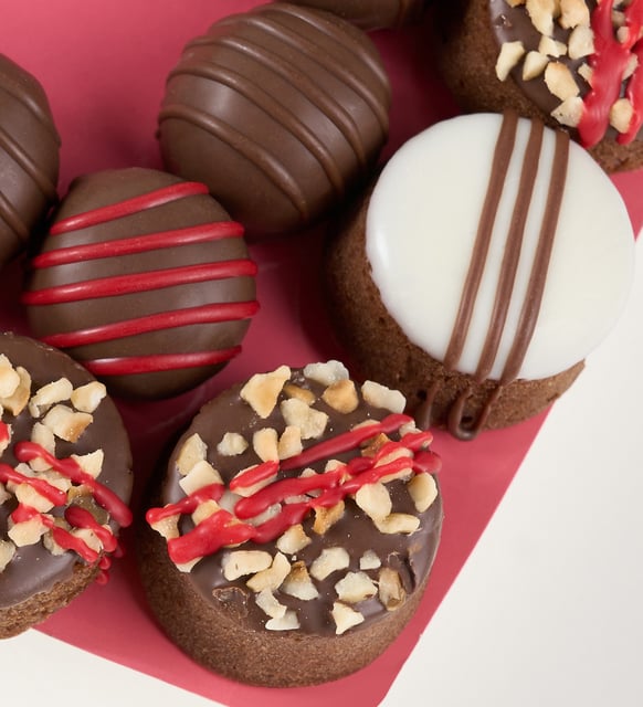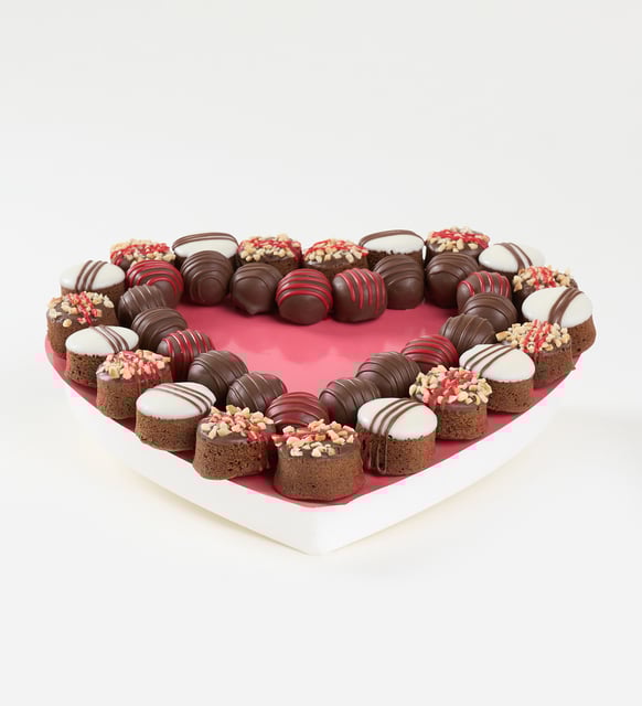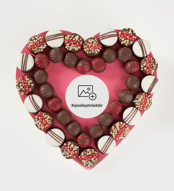 Somon tonunda küçük bir kalp üzerinde buluşan koyu kakao dokunuşları, sakin bir akşamın zarafeti gibi derin ve yumuşak. Silindir ve trüf formlarının dengesi ipeksi kuvertürle akarken, kırmızı kokolinin ince parıltısı ve kavrulmuş pirinç fındığın narin çıtırtısı duyulara hafifçe temas eder. Kişiye özel sticker, bu tatlı kompozisyona size ait bir imza ekler; anıların arasına zarif bir not gibi yerleşir.