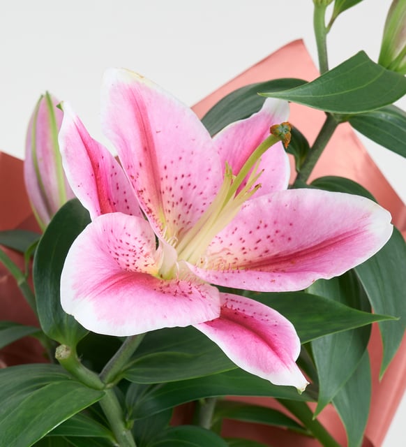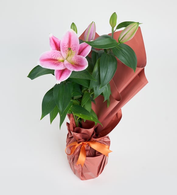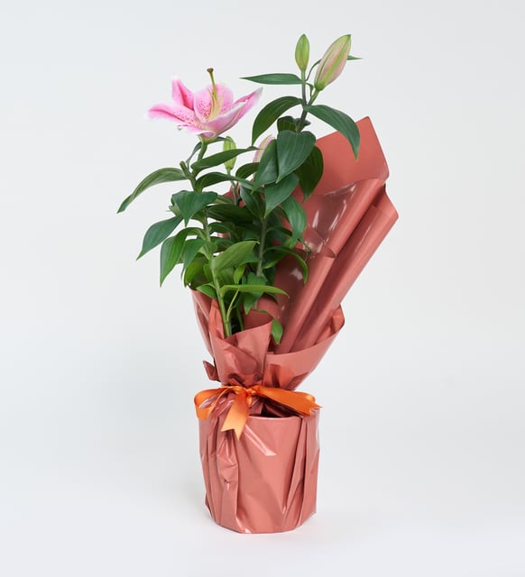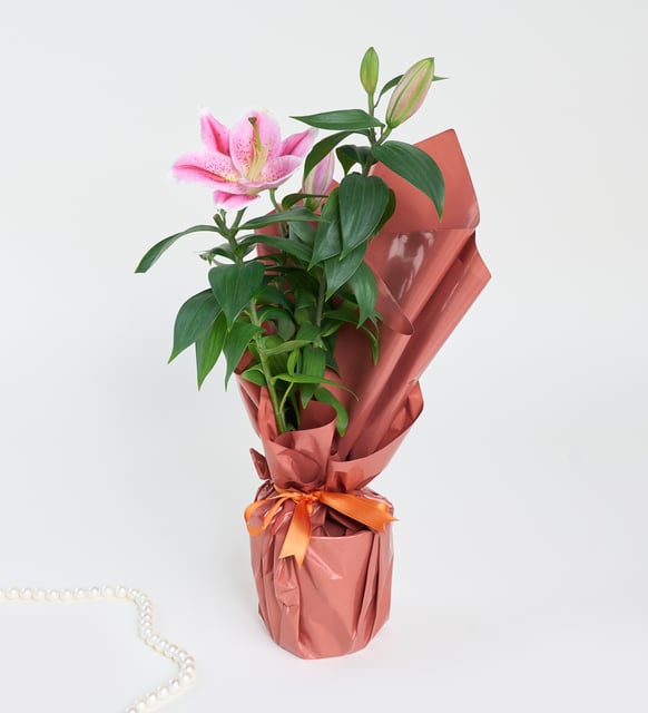 Yumuşak pembenin dinginliği, beyaz bir saksının sade çizgilerinde saklanır. Koyu somon tonundaki buket kağıdı, aranjmana sıcak bir arka plan sunar; turuncu kurdele ince bir sahne perdesi gibi eşlik eder. Pembe lilyumların açılışı, içten bir şefkat duygusunu hatırlatır. Bu kompozisyon, bulunduğu mekanda sakin bir denge kurar, söz gerektirmeden duygu taşır.