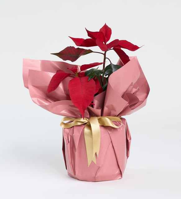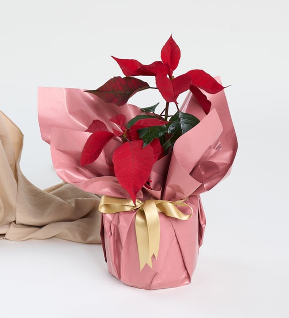 Koyu Somon Kağıtlı Beyaz Polimer Saksıda Ponsetya