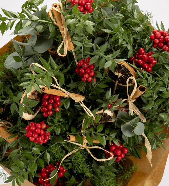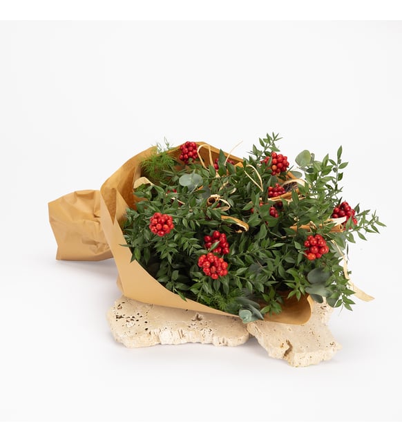 Kırmızı meyveleri nazikçe bir araya toplayan ip, dileklerin suya düşen sesi gibi; şans, mutluluk ve bereketi birbirine bağlayan bir küçük ritüel. Kokina, kışın serin ışığında sıcak bir kıvılcım taşıyor. Doğal kraft kağıdın sakin dokusu, tarçının ılıklığı ve kurutulmuş limonun ferah notasıyla yumuşak bir denge kurarken; okaliptusun serin nefesi ve cipsonun ince beyazlığı bukete hafif, zarif bir ritim ekliyor. Kırmızı kurdele ve burlap ip, yılın eşiğinde hissedilen o sade coşkuyu usulca tamamlıyor.