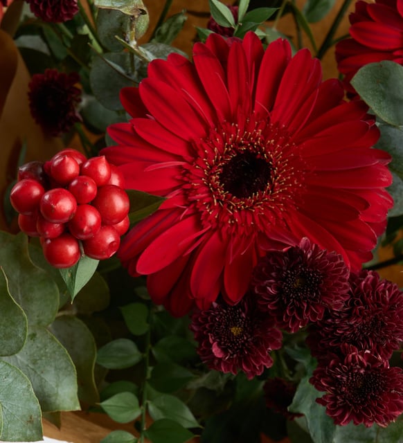 Kışın dinginliğini, yeni yılın içe dönük sevincini taşıyan bir kompozisyon. Kokina tanelerinin kadife kırmızısı, gerberaların canlı ışığı ve bordo top krizantemlerin derin tonu; okaliptusun serin nefesiyle buluşuyor. Kraft kâğıdın dokusu ve kırmızı kurdele, bir armağan ritüelinin zarif son cümlesi gibi.