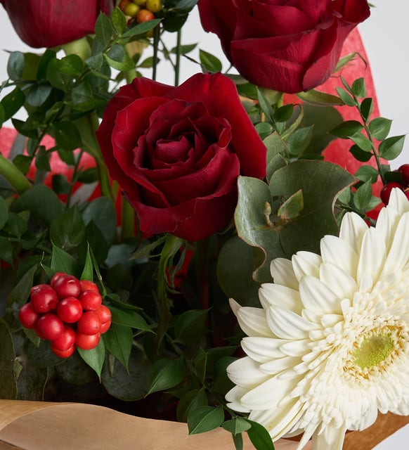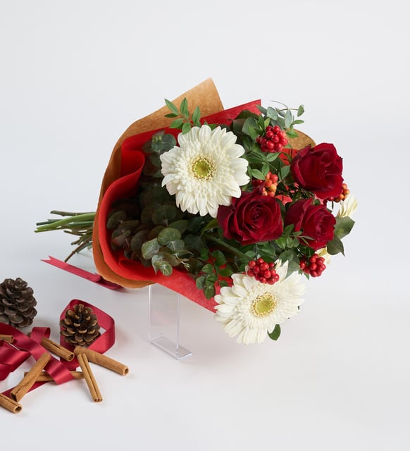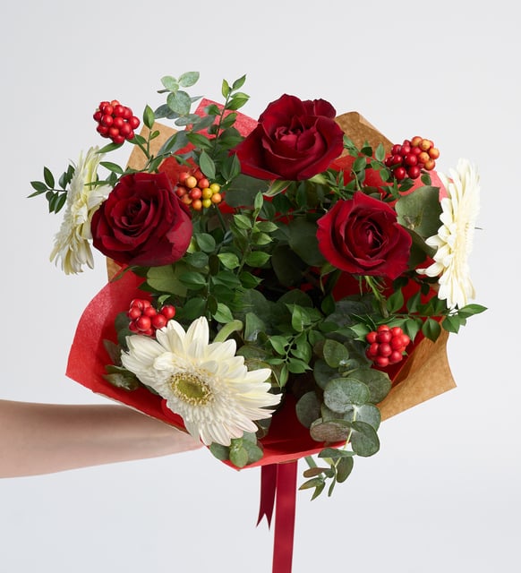 Kraft dokunun sıcaklığına yaslanan bir kış hissi. Kokinanın canlı kırmızısı, beyaz gerberanın berrak ışığı ve ithal kırmızı güllerin derin romantizmi, okaliptusun serin çizgileriyle dengelenir. Kırmızı kurdele, yeni yılın ritmini usulca taşıyarak bulunduğu mekana yumuşak bir enerji bırakır. Evde, ofiste ya da küçük kutlamalarda; neşeyle sükunetin buluştuğu o anı zarifçe işaret eder.