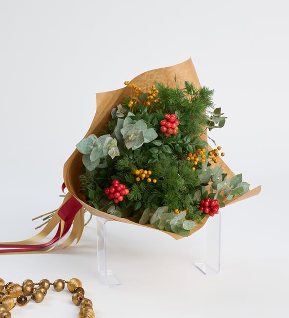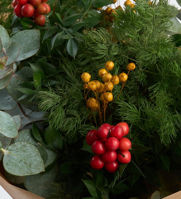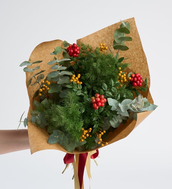 Kış akşamlarının yumuşak sessizliği, kırmızı kokina tanelerinde küçük birer iyimserlik gibi parlıyor. Sarı luna, altın bir ışıltıyı anımsatırken, okaliptusun serin yeşiliyle mirkeladusun derin dokusu bukete dingin bir denge katıyor. Doğal kraft kâğıdın sıcak dokusu ve zarif, sarı yaldızlı kurdele bu buluşmayı sakin bir ritüele dönüştürüyor. Eski yıl ile yenisinin arasındaki o kısa, anlamlı eşiğe uygun bir güzellik; evde, ofiste, kalbin yakın durmak istediği her yerde.