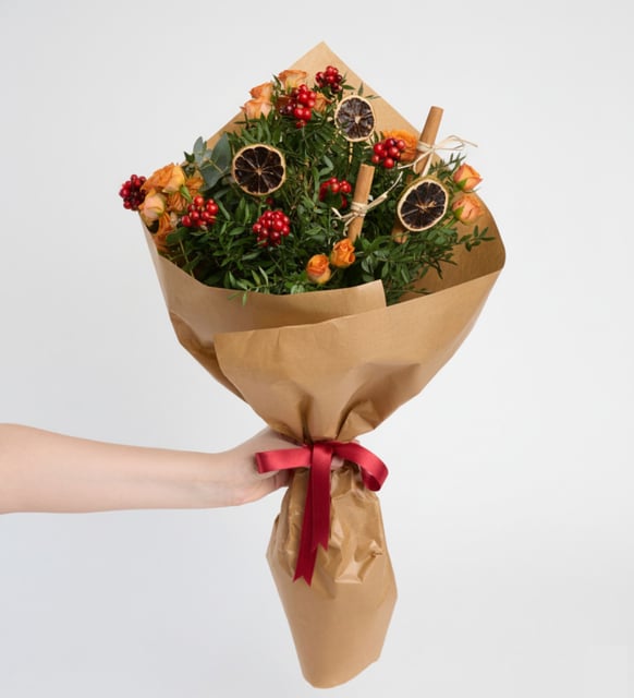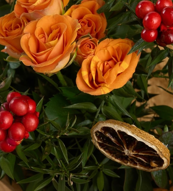 Kış akşamlarının dingin ışığına karışan sıcak bir renk. Turuncu çardak güller, kraft dokunun doğal yalınlığıyla buluşurken, kokinanın kırmızı meyveleri iplerle bir araya getirilir. Bu küçük ritüelin, şansı, mutluluğu ve bereketi nazikçe birbirine bağladığına inanılır. Tarçın çubuklarının yumuşak kokusu ve kurutulmuş limon dilimlerinin narin dokusu, okaliptusun serin nefesi ve cipsonun ince beyazlığıyla tamamlanır. Ortaya, yılbaşı ruhunu abartısız bir zarafetle hatırlatan bir buket çıkar.