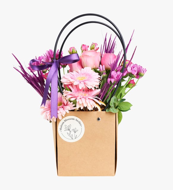 Pembenin yumuşak tonu, kalbin içine sızan bir dinginlik gibi. Çardak güllerin ince zarafeti, tekli güllerin masum duruşuyla buluşurken; gerberaların içten bakışı ve papatyaların hafif neşesi aranjmana temiz bir ışık yayıyor. Solucan otunun doğal dokusu ve kurutulmuş limonun güneş görmüş hatırası, premium kraft çantanın sade çizgileriyle uyum içinde. Mor kurdele, bütünlüğe zarif bir nokta koyuyor.