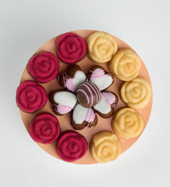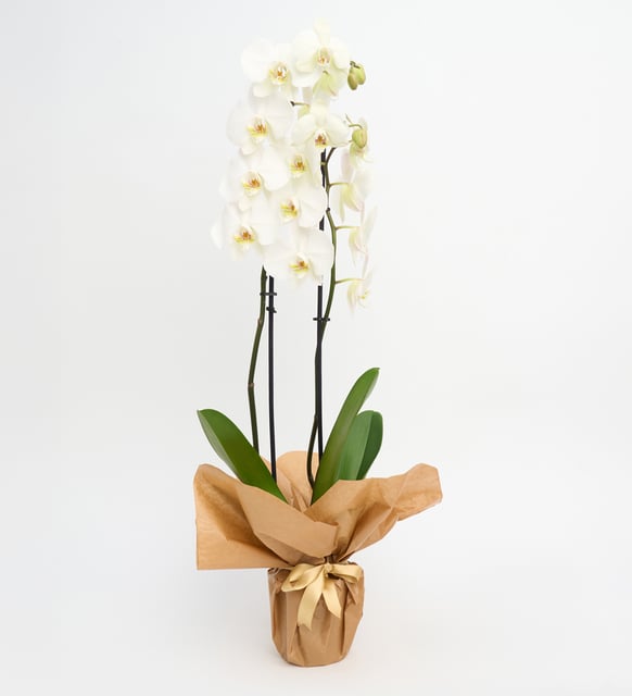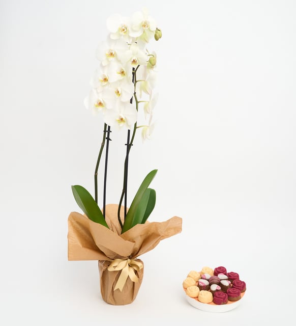 Beyaz orkidenin sakin parıltısı, kraft dokunun doğal sıcaklığıyla buluşur. Yanında, kırmızı gül biçimli küçük keklerin canlı rengi ve tek bir siyah kakaolu trüfün derin notası. Yaklaşık 60 cm’lik zarif bir siluet; mekana sessiz bir nezaket, yalın bir sevinç getirir.