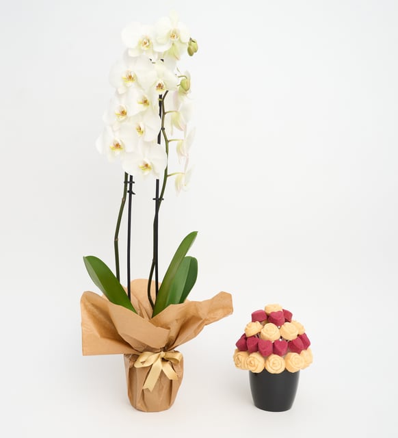 Bir kutlamanın en sakin anı… Beyaz orkidenin dingin nefesi, kraft dokunun sıcaklığıyla buluşur. Yanında duran siyah saksıdaki kek buketinden yükselen beyaz gül biçimli dokular ve kırmızı kalp formları, sevginin hem zarif hem içten tarafını fısıldar. Bir araya geldiklerinde, hatıraları yormadan saklayan, uzun süreli bir zarafet hissi bırakırlar.