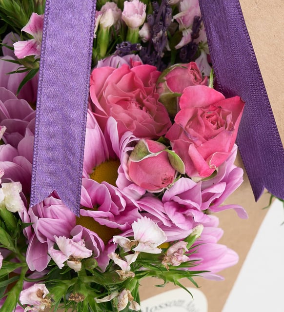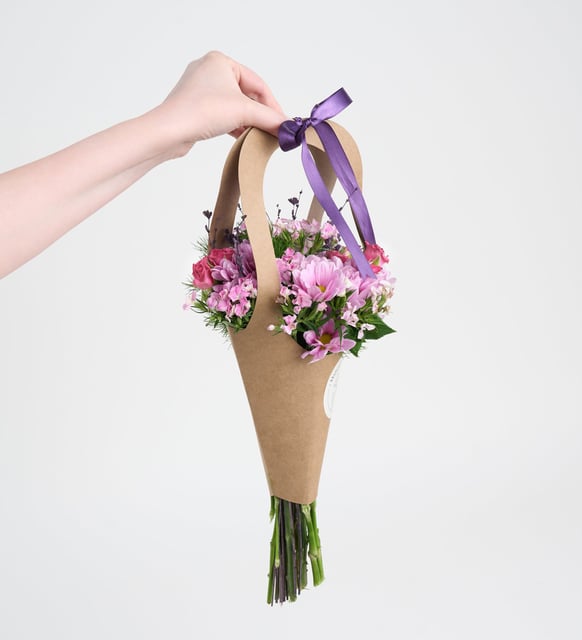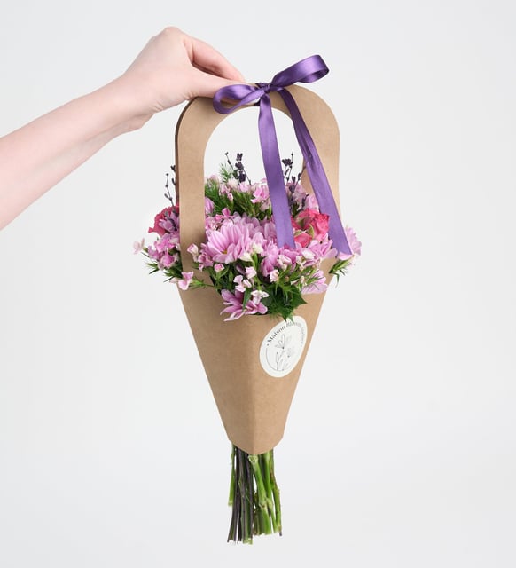 | Süsleme | Mor kurdele ile süslenmiş, kraft taşımalı buket |