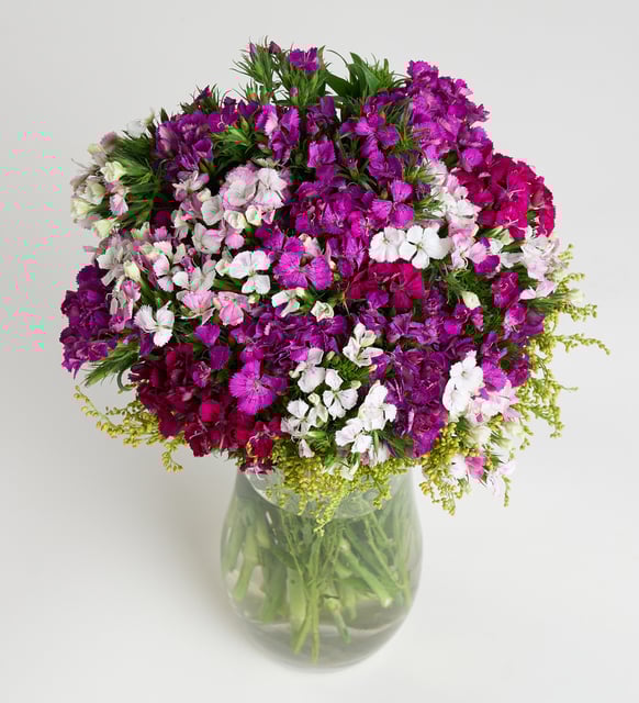 Kır sabahlarının dinginliğini iç mekana taşıyan zarif bir duruş. Hüsnüyusufların narin dokusu kristal camın sakin berraklığında toplanır; solidasterın bal rengi taneleri araya süzülen ışık gibi yumuşak bir parıltı bırakır. Sade, ölçülü, ince bir güzellik… Günün akışına küçük bir nefes aralığı.