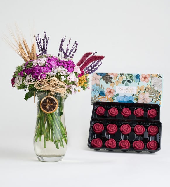 Renklerin birbirine fısıldadığı dingin bir bahçe hissi. Kristal cam silindir içinde hüsnüyusufların canlı dokusu, sarı luna ve lavantanın yumuşak nefesiyle dengeleniyor; mor setteria ve başak buğdayı, kurutulmuş limonun hafif sürpriziyle kompozisyona pastoral bir ritim katıyor. Yanında 20 adet kırmızı gül kek, tatlı bir ara an gibi, çiçeklerin hikayesine zarif bir lezzet eşlikçisi oluyor. Günün akışına küçük bir duruş, masaya yayılan sakin bir mutluluk.