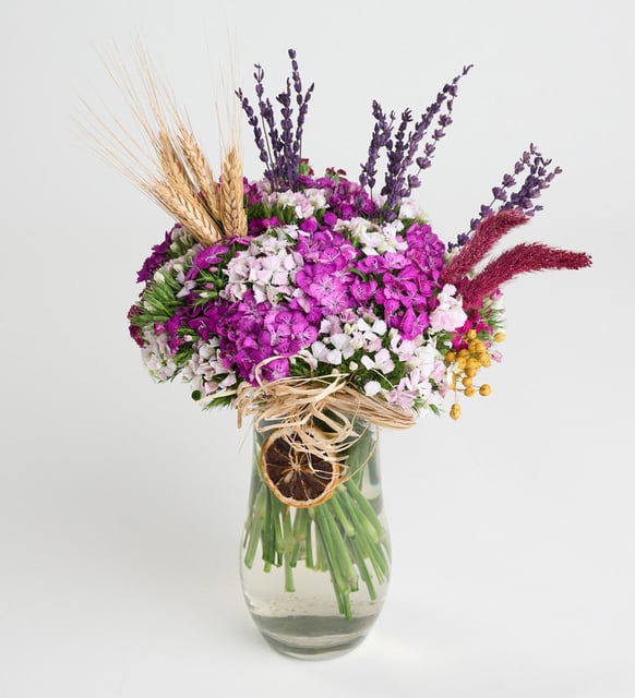 | Süsleme | Sarı luna, lavanta, mor setteria, başak buğday ve kurutulmuş limon ile süsleme |